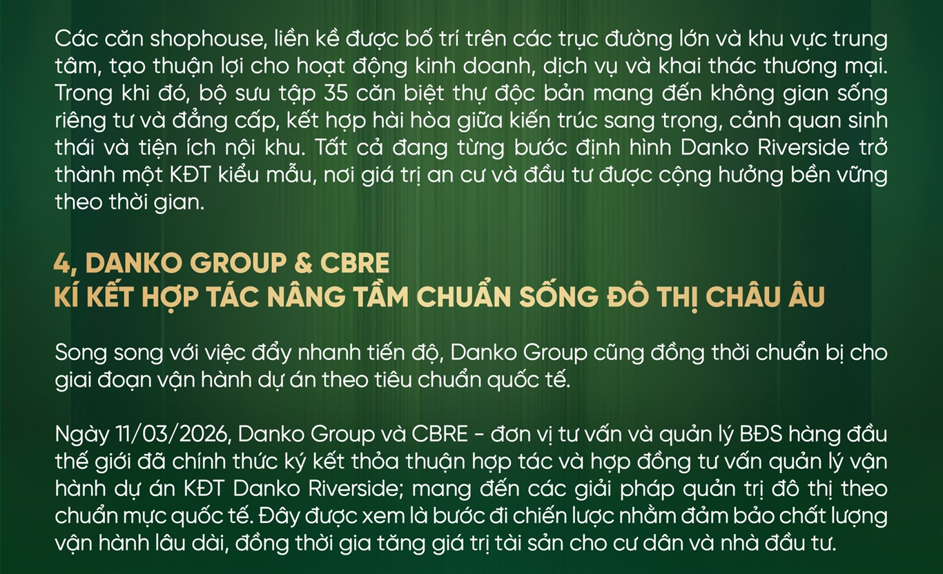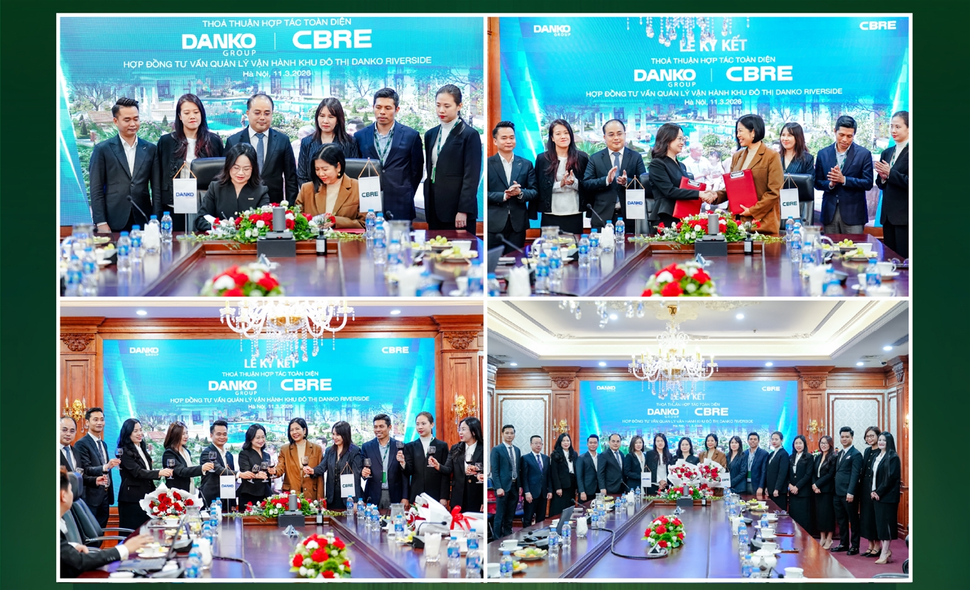 Ngày 11/03/2026, Danko Group và CBRE - đơn vị tư vấn và quản lý vận hành bất động sản (BĐS) hàng đầu thế giới - đã chính thức ký kết Thỏa thuận hợp tác toàn diện và Hợp đồng tư vấn quản lý vận hành dự án Khu đô thị (KĐT) Danko Riverside. Sự kiện đánh dấu bước tiến quan trọng trong chiến lược phát triển dự án, hướng tới thiết lập những tiêu chuẩn vận hành chuyên nghiệp và tiệm cận chuẩn mực quốc tế.
