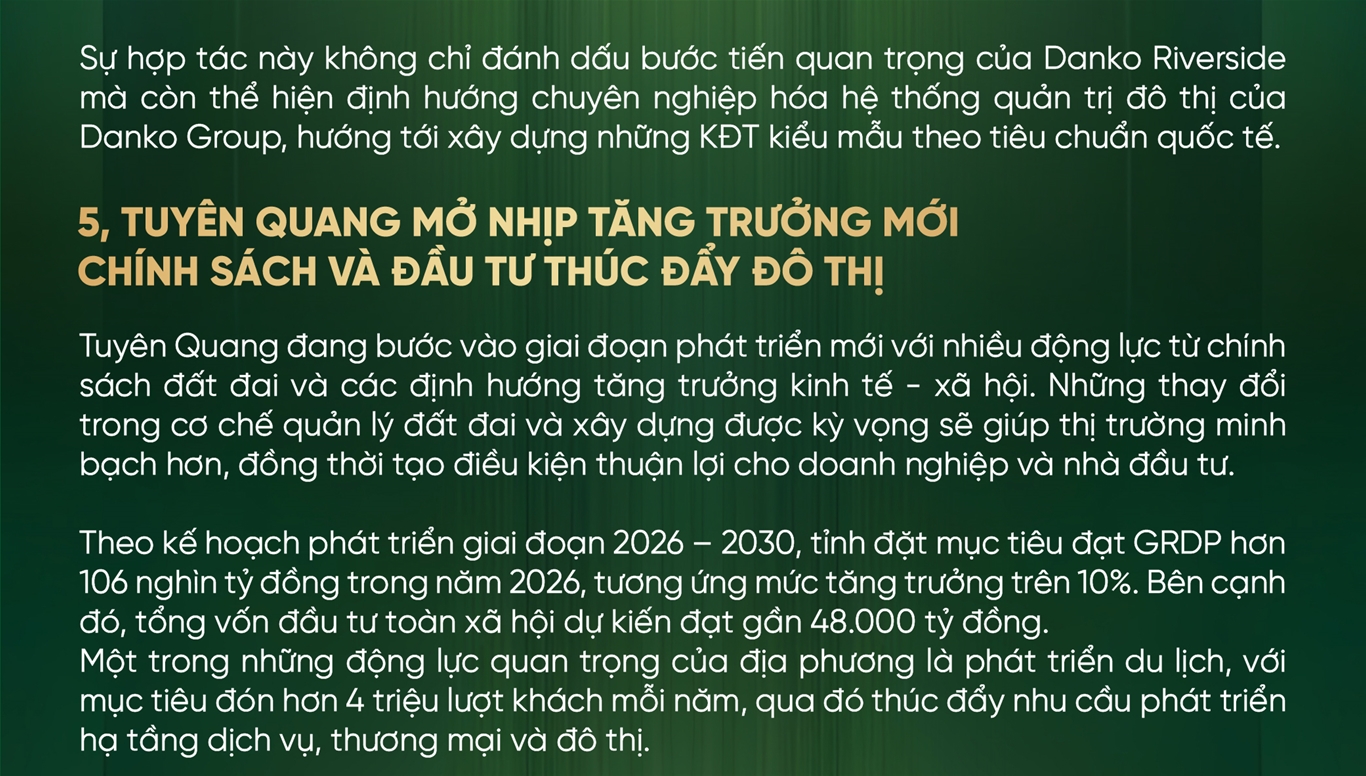 Sau sáp nhập tỉnh, Tuyên Quang đang đẩy mạnh đầu tư hạ tầng và mở rộng không gian đô thị, Danko Center nổi bật và thu hút nhà đầu tư như một khu đô thị tiên phong, góp phần định hình phong cách sống thượng lưu, tầm nhìn hiện đại bậc nhất tỉnh Tuyên Quang.